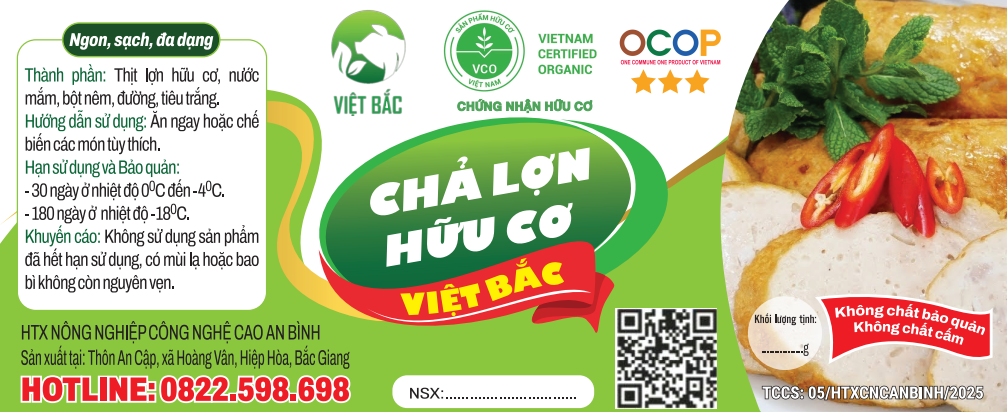 Chả lợn hữu cơ Việt Bắc là một sản phẩm thực phẩm chế biến sẵn, được làm từ thịt lợn nuôi theo tiêu chuẩn hữu cơ, sử dụng thức ăn tự nhiên và thảo dược, cam kết không hàn the, chất bảo quản và phẩm màu. Sản phẩm này giàu dinh dưỡng, tốt cho sức khỏe, có thể ăn ngay hoặc chế biến thành các món ăn khác. Bữa cơm gia đình hay tiệc cưới hội nghị sẽ trở nên sang trọng và an toàn hơn với sản phẩm được chế biến theo dây chuyền công nghệ tự động, đảm bảo vệ sinh an toàn thực phẩm. Sản phẩm đạt chứng nhận OCOP 3 sao vào tháng 6 năm 2025.