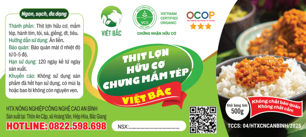 “Thịt chưng mắm tép hữu cơ Việt Bắc” là món ăn đặc sản miền Bắc được chế biến từ thịt lợn hữu cơ và mắm tép cùng một số gia vị thông dụng truyền thống khác, tạo nên hương vị đậm đà, thơm bùi đặc trưng. Sản phẩm giàu dinh dưỡng, tốt cho sức khỏe, có thể ăn ngay hoặc chế biến món ăn tùy thích. Bữa cơm gia đình hay tiệc cưới hội nghị sẽ trở nên sang trọng và an toàn hơn với sản phẩm được chế biến theo dây chuyền công nghệ tự động, đảm bảo vệ sinh an toàn thực phẩm. Sản phẩm đạt chứng nhận OCOP 3 sao vào tháng 6 năm 2025.